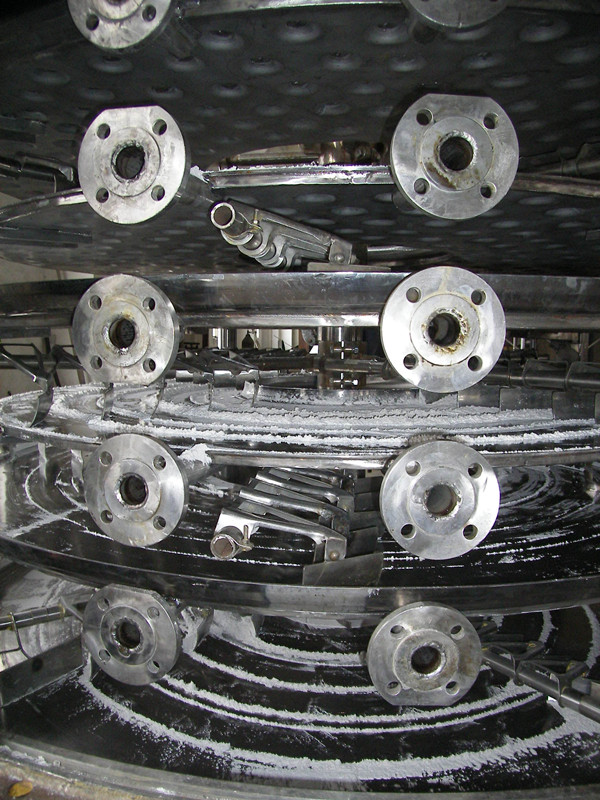 盤式連續(xù)干燥機是一種高效的傳導型連續(xù)干燥設備。其獨特的結構和工作原理決定了它具有熱效率高、能耗低,占地面積小、配置簡單、操作控制方便、操作環(huán)境好等特點,廣泛適用于化工、醫(yī)藥、農(nóng)藥、食品、飼料、農(nóng)副產(chǎn)品加工等行業(yè)的干燥作業(yè)。在各行業(yè)使用實踐中深受好評,F(xiàn)生產(chǎn)制造常壓、密閉、真空三大類型、1200、1500、2200、3000四種,A(碳鋼)、B(接觸物料部分均布不銹鋼)、C(在B的基礎上,增加蒸汽管路、主軸及支架為不銹鋼,筒體和蓋頂內襯不銹鋼)。三種材質,干燥面積4~180m 2,共幾百種型號的系列產(chǎn)品,并能提供與之相配套的種輔助設備,可滿足用戶對各種物料進行干燥的需要。濕物料自加料器連續(xù)地加到干燥器上部第一層干燥盤上,帶有耙葉的耙臂作回轉運動使耙臂作回轉運動使耙葉連續(xù)地翻抄物料。物料沿指數(shù)螺旋線流過干燥盤表面,在小干燥盤上的物料被移送到外緣,并在外緣落到下方的大干燥盤外緣,在大干盤上物料向里移動并從中間落料口落如下一層小干燥盤中。大小干燥盤上下交替排列,物料得以連續(xù)地流過整個干燥器。中空的干燥盤內通入加熱介質,加熱介質形式有飽和蒸汽、熱水和導熱油,加熱介質由干燥盤的一端進入,從另一端導出。已干物料從最后一層干燥盤落到殼體的底層,最后被耙葉移送到出料口排出。濕份從物料中逸出,由設在頂蓋上的排濕口排出,真空型盤式干燥器的濕氣由設在頂蓋上的真空泵口排出。從底層排出的干物料可直接包裝。通過配加翅片加熱器、溶劑回收冷凝器、袋式除塵器、干料返混機構、引風機等輔機,可提高其干燥的生產(chǎn)能力,干燥膏糊狀和熱敏性物 料,可方便地回收溶劑,并能進行熱解和反應操作。 | ||